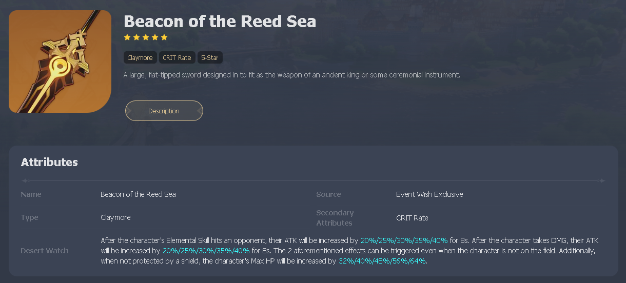 Source: sarahomeqhf.pages.dev Beacon of the Reed Sea Weapon Guide Genshin Impact HoYoLAB , (Picture: HoYoverse) Refinement Level 1: After the character's Elemental Skill hits an opponent, their ATK will be increased by 20% for 8s Beacon of the Reed Sea (Image via HoYoverse) Genshin Impact might release two new units in its upcoming update, and a brand new 5-star Claymore called the Beacon of the Reed Sea