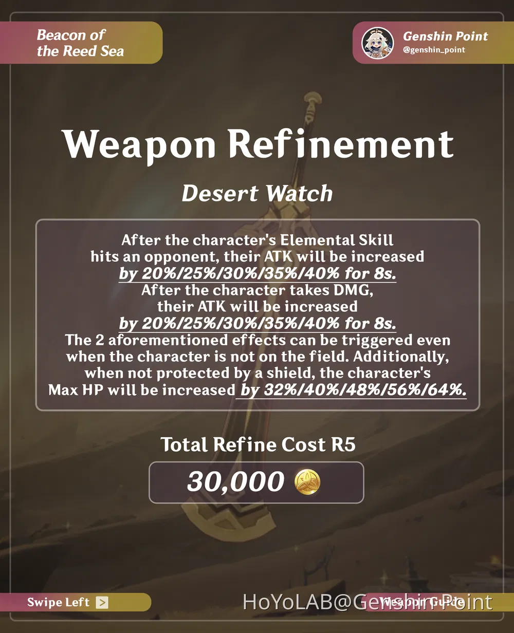 . It is Dehya's signature weapon, and can be obtained through wishing on Event-Exclusive Weapon Banners. (Picture: HoYoverse) Refinement Level 1: After the character's Elemental Skill hits an opponent, their ATK will be increased by 20% for 8s